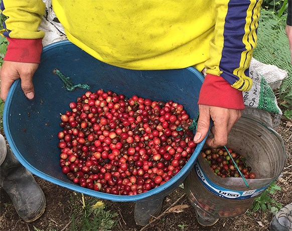 At Finca Cerró Azul, the Geisha trees grow in a unique landscape, on an elevated foothill between two mountains facing the Pacific Ocean. The windward side receives a warm, mineral-rich sea breeze while the leeward side rises over Valle del Cauca and gives the valley intermittently cloudy weather. Being located between these two faces exposes the trees to fog at sunrise and sunset, with strong equatorial sun in the afternoon. The plentiful rain and rich volcanic soil provide conditions for the Geisha cherries to reach optimal levels of sugar.